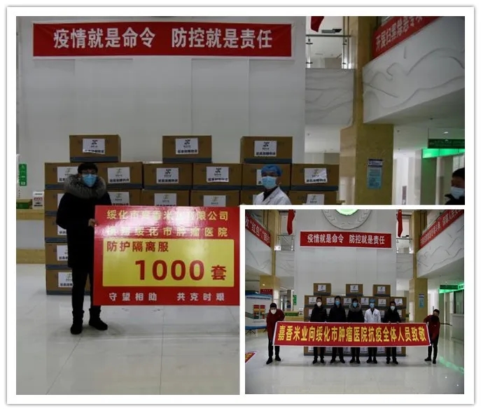 當(dāng)?shù)弥械谝会t(yī)院防疫物資特別是防護(hù)服緊缺公告后。嘉香米業(yè)公司第一時(shí)間與醫(yī)院取得聯(lián)系,并通過全國合作伙伴關(guān)系網(wǎng)聯(lián)系生產(chǎn)廠家。在興綏慈善基金募集的12.8萬元基礎(chǔ)上,公司再次追加捐款25.6萬元,訂購了3000套防護(hù)服和醫(yī)療防護(hù)物資。