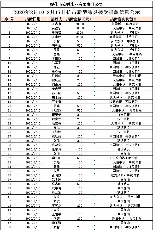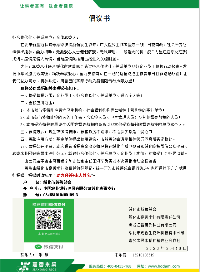 2020年春季新冠狀病毒肺炎爆發(fā),疫情發(fā)生后,嘉香米業(yè)積極行動,勇于擔(dān)當(dāng)。通過全國經(jīng)銷商聯(lián)系到疫情重點(diǎn)收治醫(yī)院—華中科技大學(xué)附屬武漢市同濟(jì)醫(yī)院,2月8日向該醫(yī)院三個院區(qū)共捐贈25噸寒地香米價值25萬余元。2月12日又通過河南辦事處緊急調(diào)撥,向河南省疫情重點(diǎn)收治醫(yī)院南陽市醫(yī)專附屬第三醫(yī)院捐贈600多件寒地香米價值2萬元;向信陽市中心醫(yī)院捐贈寒地香米1000多件價值6萬元。2月10日通過“興綏慈善愛心基金會”向公司員工、全國經(jīng)銷商及當(dāng)?shù)孛讟I(yè)同行發(fā)起募捐倡議。截止2月16日募集善款19.7萬元。2月18日開始利用善款向綏化市區(qū)防控執(zhí)勤人員捐贈電熱寶近500個。當(dāng)?shù)弥械谝会t(yī)院防疫物資特別是防護(hù)服緊缺公告后。嘉香米業(yè)公司第一時間與醫(yī)院取得聯(lián)系,并通過全國合作伙伴關(guān)系網(wǎng)聯(lián)系生產(chǎn)廠家。在興綏慈善基金募集的12.8萬元基礎(chǔ)上,公司再次追加捐款25.6萬元,訂購了3000套防護(hù)服和醫(yī)療防護(hù)物資,其中1700套防護(hù)服捐贈給市第一醫(yī)院,1000套捐贈給市傳染病醫(yī)院第二病區(qū),200套捐贈給市殯葬管理所,100套捐贈給市救助站,2月25日,向綏化市城市養(yǎng)老服務(wù)中心捐贈現(xiàn)金1萬元,防護(hù)口罩500個??們r值12500元。向北林區(qū)秦家鎮(zhèn)政府捐贈防護(hù)口罩3000個,防護(hù)服30套,電熱寶30個,酒精10桶??們r值1.9萬余元。嘉香米業(yè)公司不遺余力的為慈善事業(yè)作貢獻(xiàn),為堅守在一線的抗疫人員加強(qiáng)防護(hù),保障抗疫人員的生命健康安全。