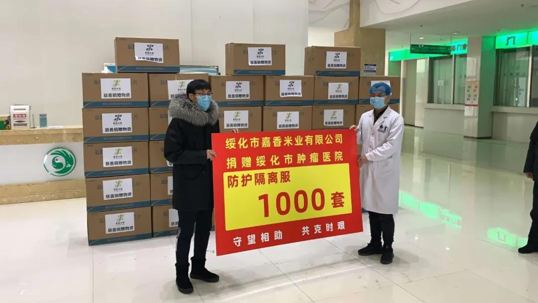 陣陣寒風(fēng)裹挾著雪粒,風(fēng)雪中一輛滿載著包裹的小型貨車疾馳在高速公路上。2月21日傍晚,這輛貨車順利通過(guò)綏化城南收費(fèi)站入城安檢,3000件醫(yī)用防護(hù)服安全運(yùn)抵綏化。22日嘉香米業(yè)公司的總經(jīng)理宋永偉和常務(wù)總經(jīng)理郭建輝親手把這批愛(ài)心防護(hù)服交到抗“疫”前線工作人員手中。